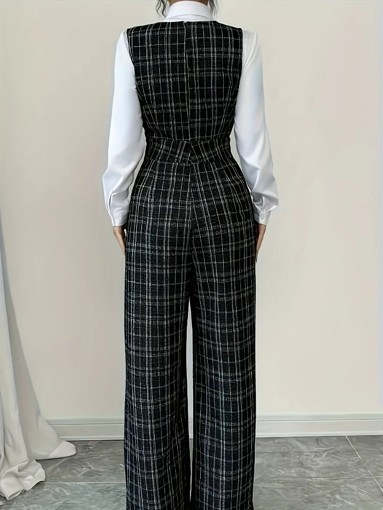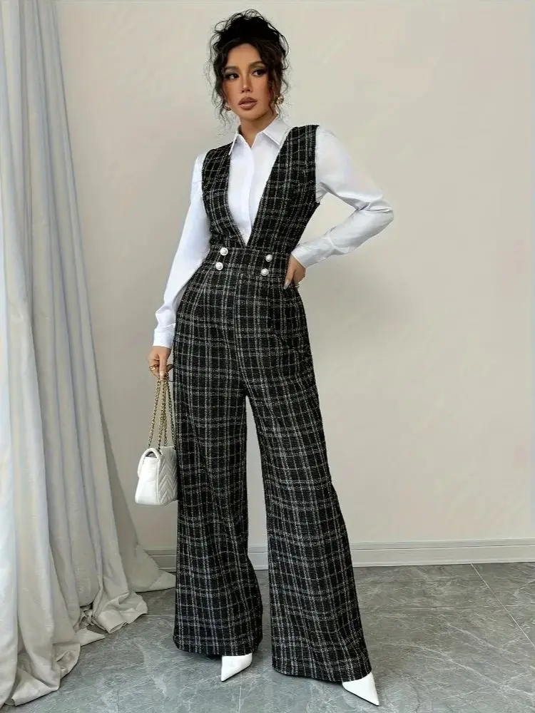 Women High Waist Wide Leg Plaid Tweed Jumpsuit Vest Style Double Breasted Pearl